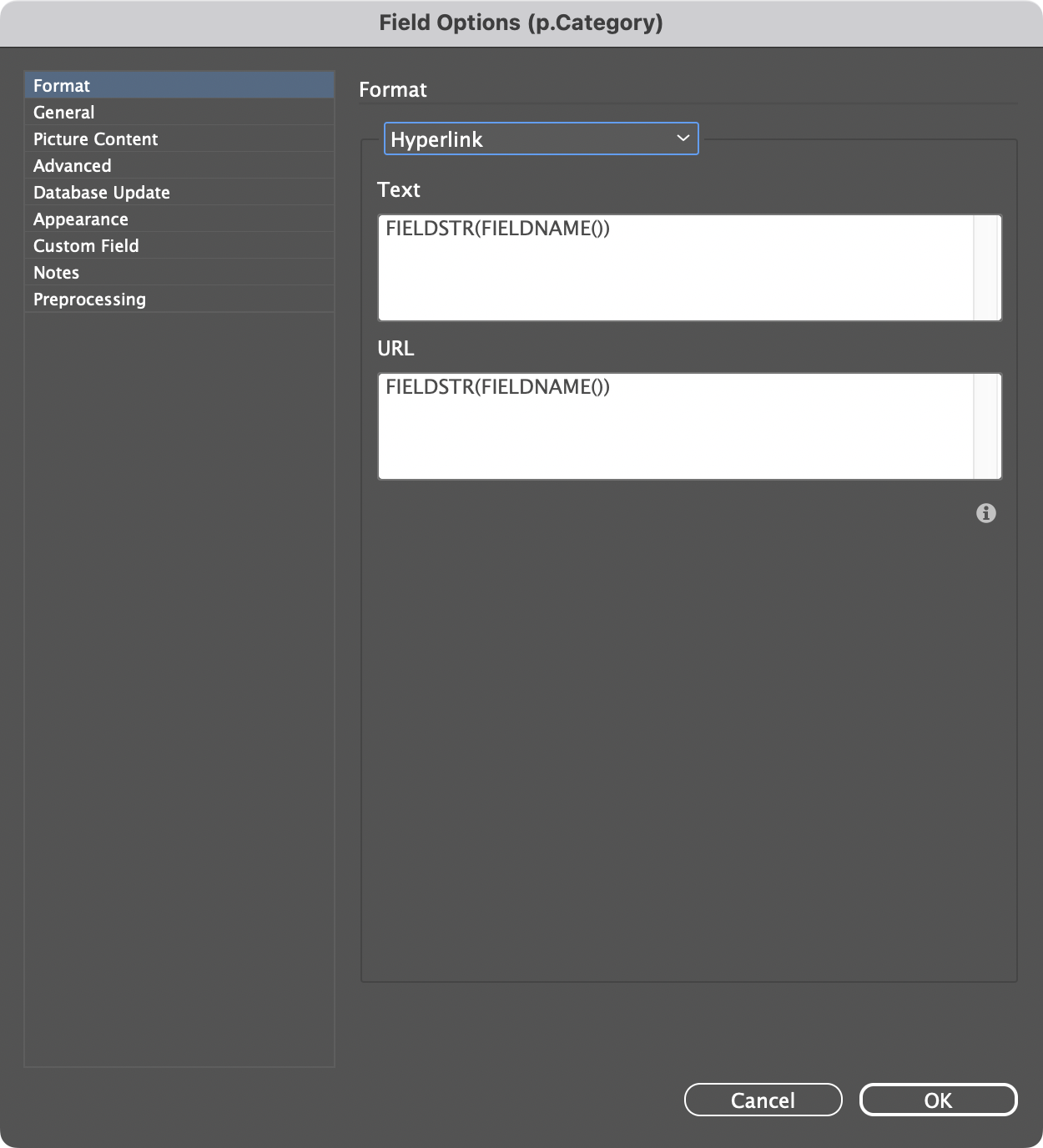 If you type *Click here* in the `Text` field and *FIELDSTR('Product URL')* in the `URL` field. When this field is inserted into the document, the text “Click Here” will appear which will be hyperlinked to the location specified in the “Product URL” field.&#x20;